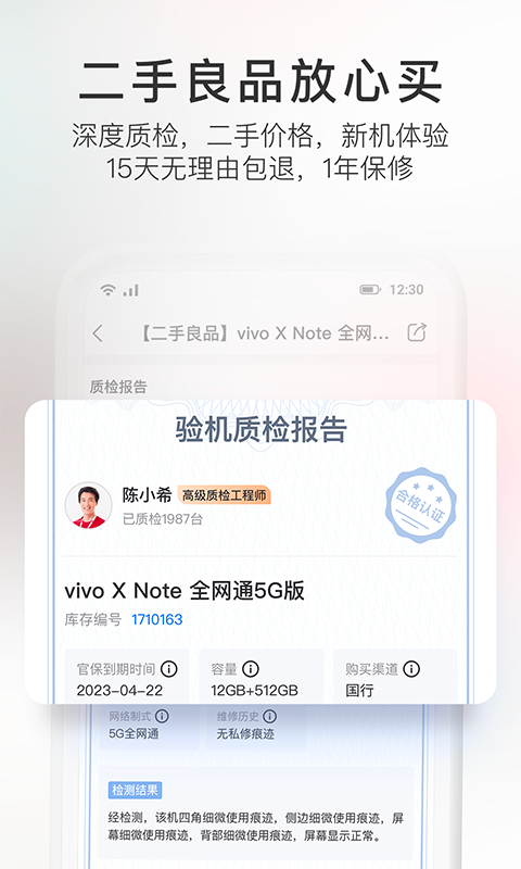 【二手良品】九机二手良品均来源合法正规渠道,外观成色好,功能正常,从源头保证良品品质。九机二手良品通过质检工程师32项深度功能,享有15天无理由退货,1年质保的服务保障服务。所有二手良品均为官方自营,无第三方或个人售卖,杜绝问题机器