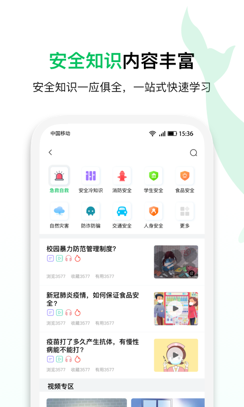 学习的方式可以是看文章、听音频、看视频,满足各种场景和习惯的需求,目前平台的内容涵盖了急救自救、安全冷知识、消防安全、学生安全、食品安全、自然灾害、防诈防骗、交通安全、人身安全、防疫安全等跟我们生活息息相关的安全知识。