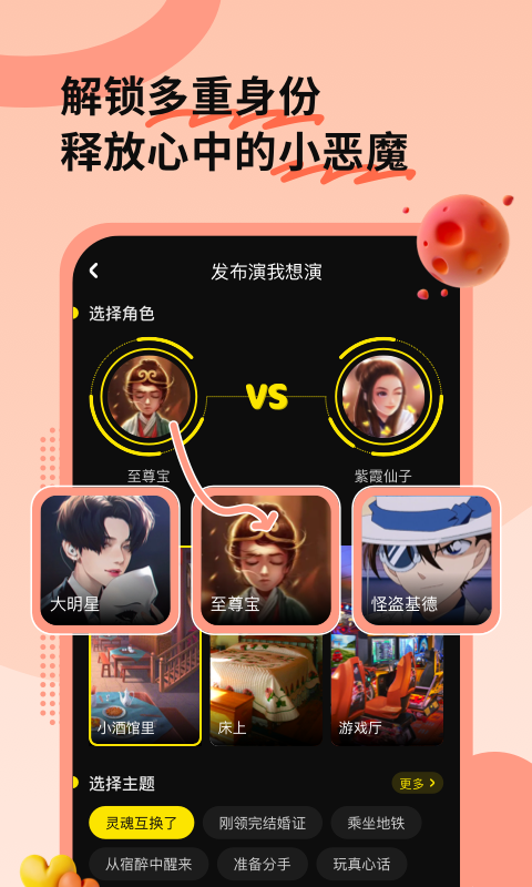玩法重磅升级!扮演你期望的角色、选择喜欢的聊天场景,一键生成你的专属小剧场,就能与另一个TA一同进入共同幻想的平行时空。语c爱好者速来~小缘缘支持上传你喜欢的角色!还能大大提升遇见同好的概率,万一能与本命谈一场甜甜的恋爱呢,和本命约会相亲不是梦~