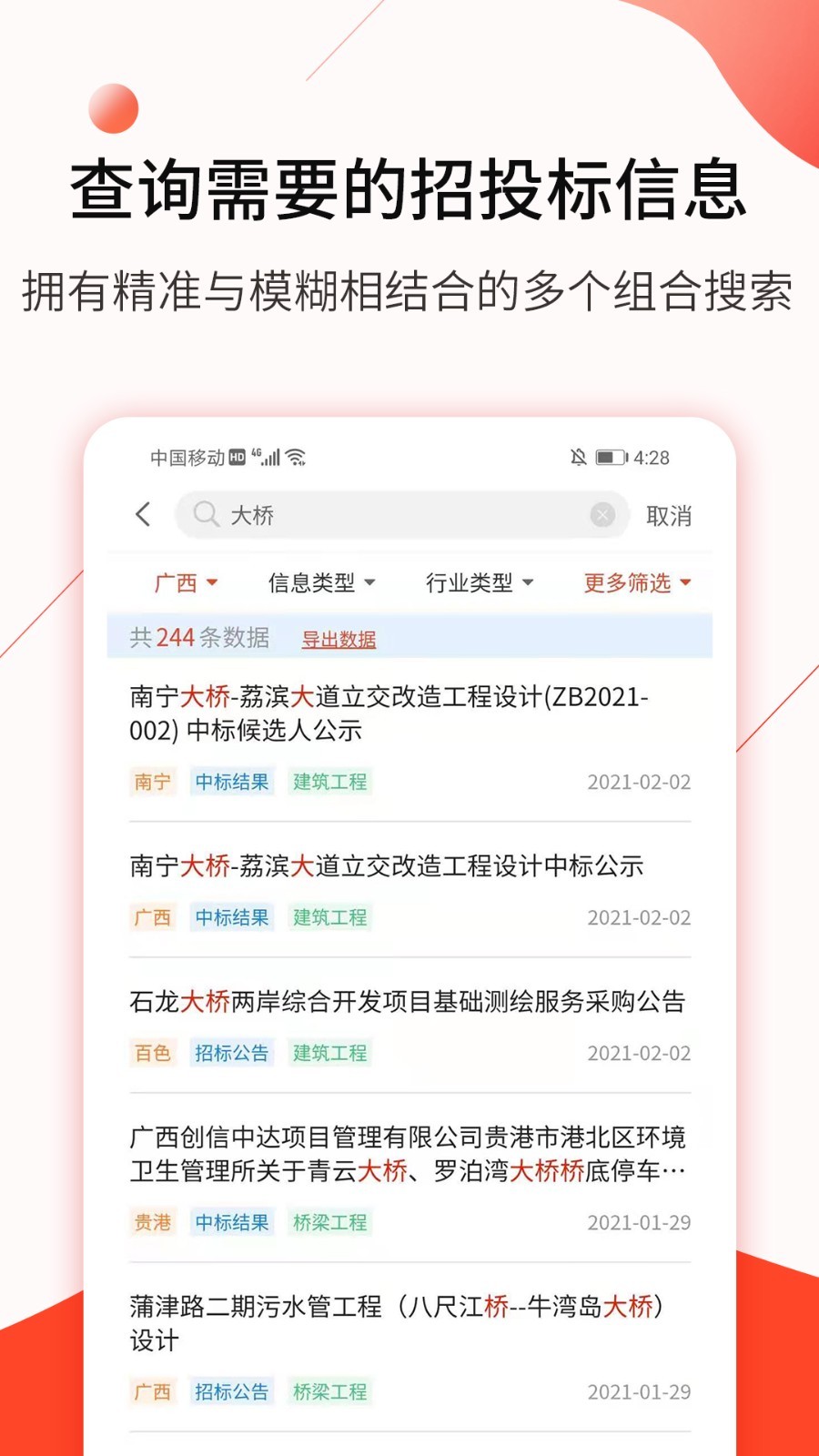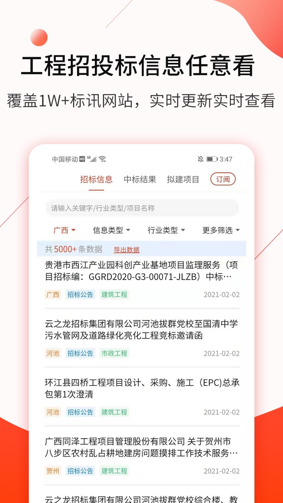 2、行讯宝APP标讯:每天更新100000+的工程行业招投标资讯,提供10000+工程拟建项目信息,给您提供招标信息订阅、标讯数据导出功能、拟建项目获取、招标项目关注等服务。