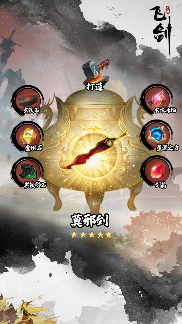 依照铸剑[图谱],收集各属性天材地宝——[矿石]、[灵液]、[异火]、[冰魄]、[雷珠]、[石胎],[风羽]、[玄玉],打造传说飞剑!