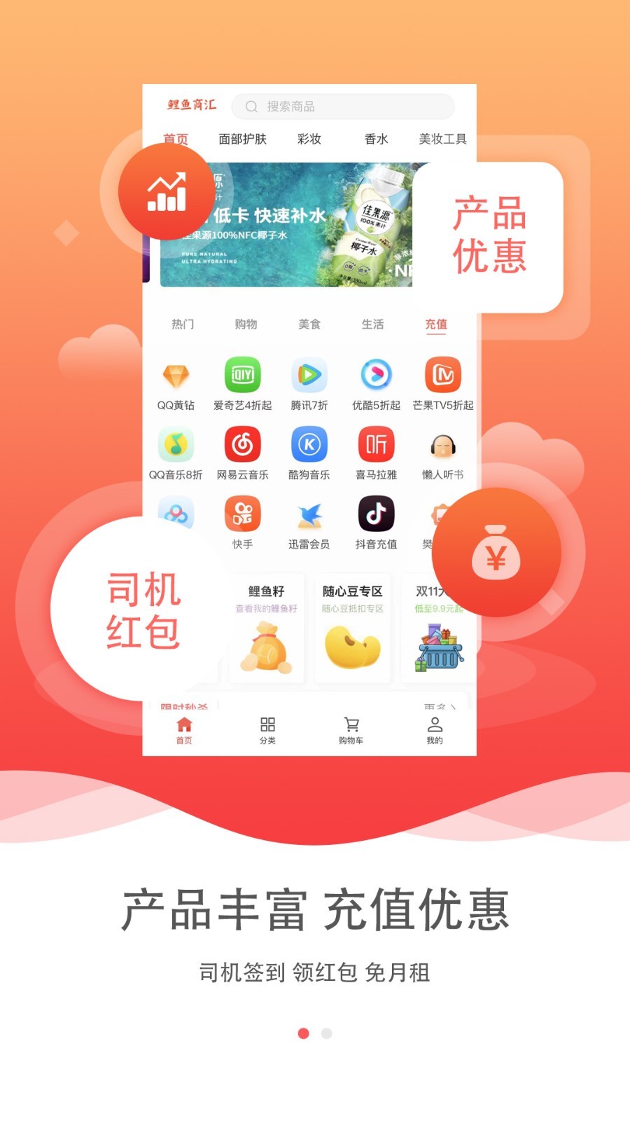 应用详情:鲤鱼商汇是展荣传媒旗下B2B2C的电商,重点对合作客户的产品进行展示及体验销售。同时在旗下随心投车载屏上进行展示,在乘车的同时,可以买到保真实惠的产品。欢迎来体验!