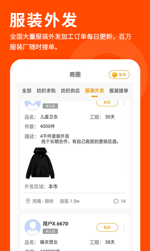 应用详情:万人群聊,服装订单外发 面料批发进货网