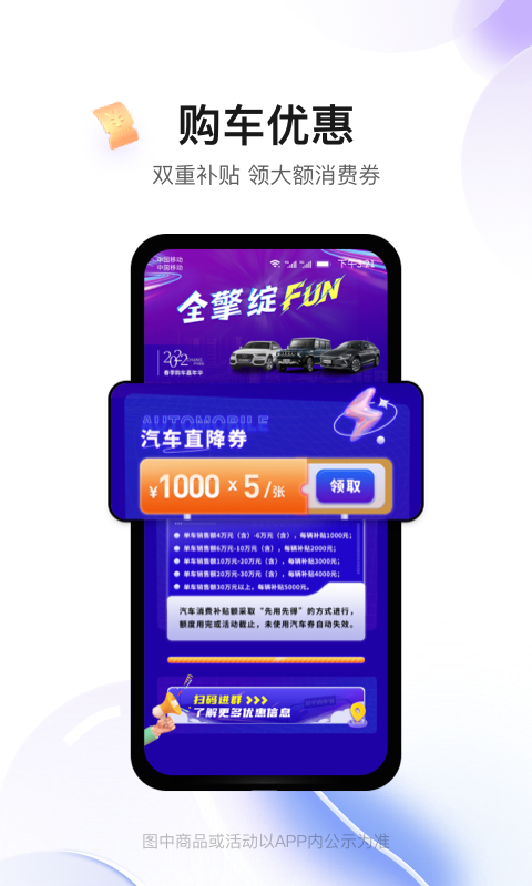 汽车活动:参与即可领取购车消费券,更可购买大额补贴券抵扣购车费用。活动区域用户均可参与,活动期间优惠补贴持续有效。活动截至时,未使用购车券自动失效。
