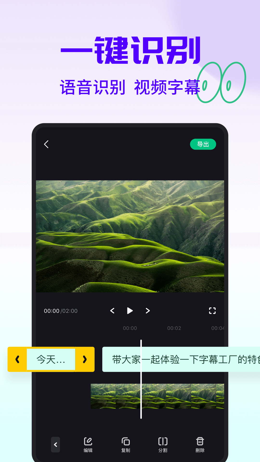 一键识别视频字幕,即用即做,一件成品,语音识别视频字幕,准确识别字幕,自由调节字体大小、位置、颜色、旋转角度、缩放比例等多种参数,画布调整,多种比例颜色随心切换,ai 换装,ai智能模板 等多种实用功能等