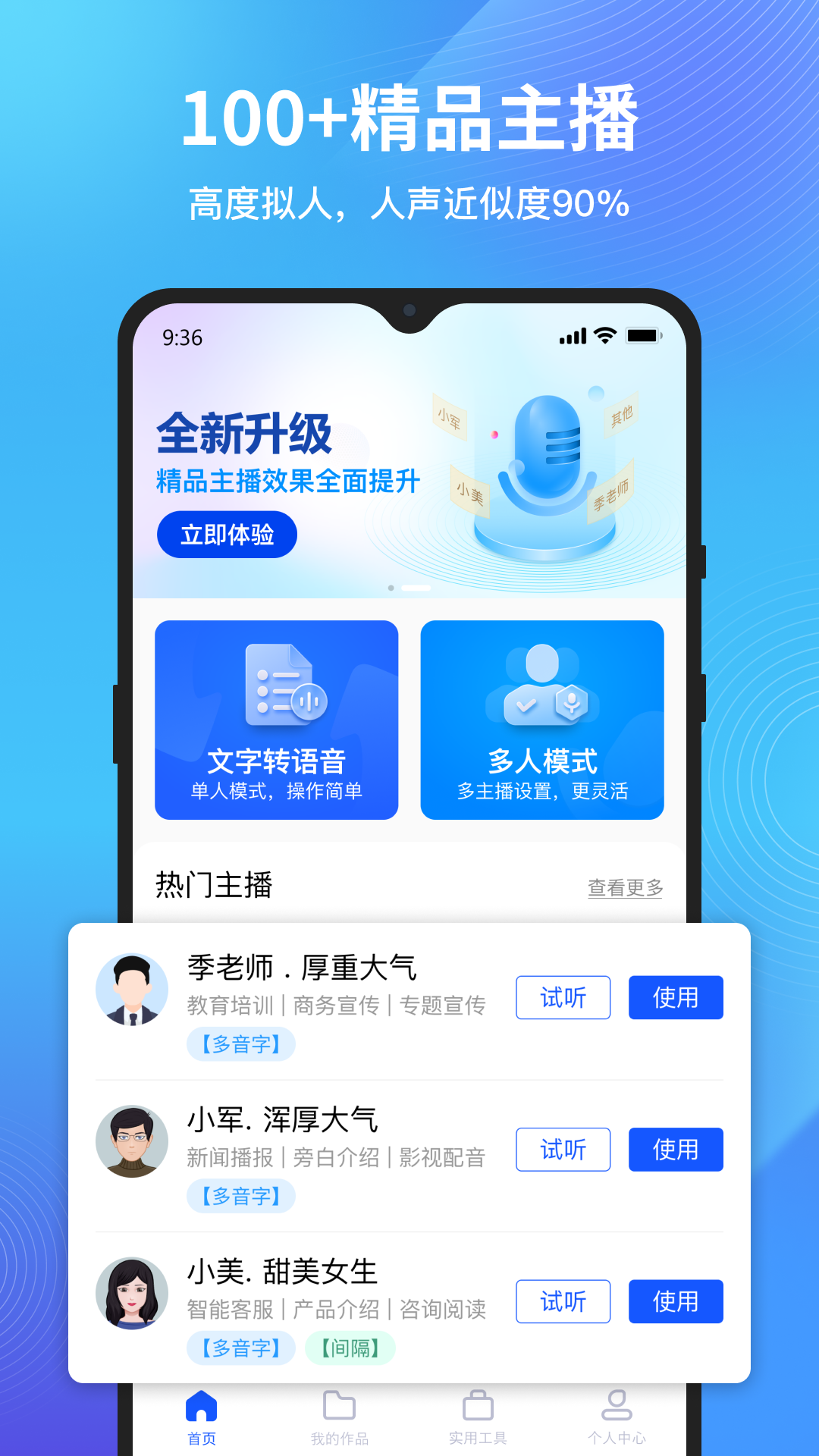 支持单人/多人朗读模式,100+精品主播,智能调整语速语调,操作简单。
