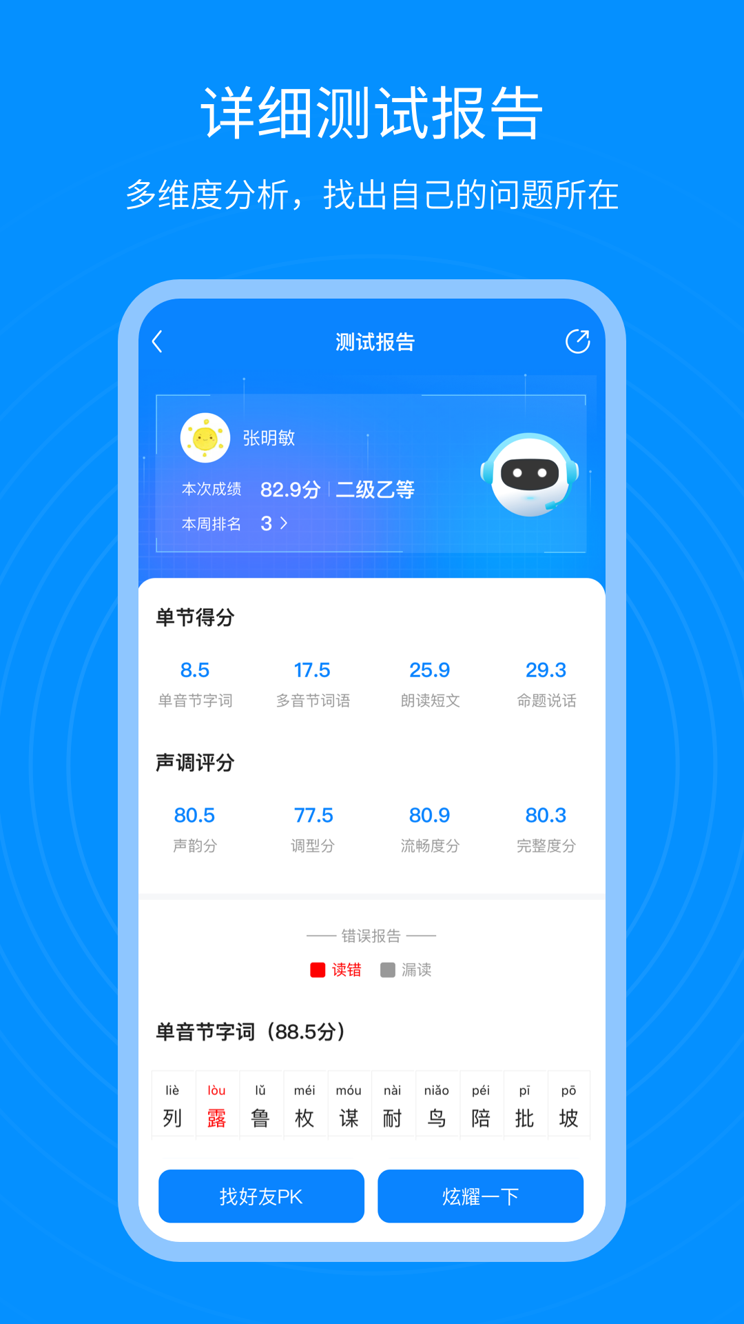 模拟真实考场,人工智能测评报告,快速了解自己普通话的真实水平。