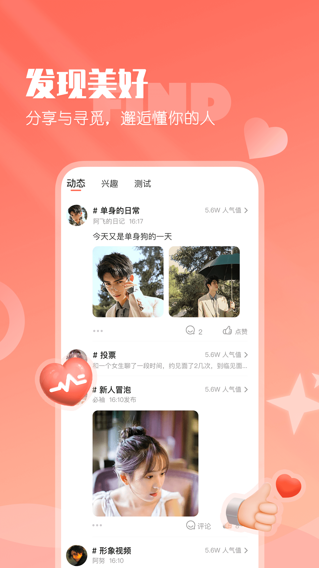 【发现美好】:发现共同兴趣的人,刷动态、投票讨论、恋爱测试等陪你一起遇见ta;