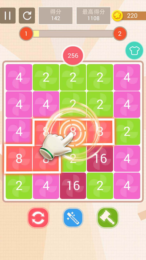 数字合合:选择连接在一起的相同数字,选中的数字+1,其他的相同数字会被消除。