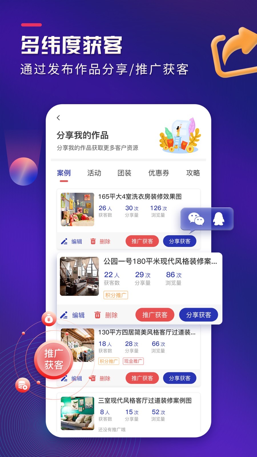 装修获客宝App是一款非常好用的获客裂变工具,功能也十分强大,上传好的案例和视频就可以常年获取同城大量的装修业主咨询线索!源源不断的客户传播 = 品牌口碑传播 + 海量装修咨询业主线索!