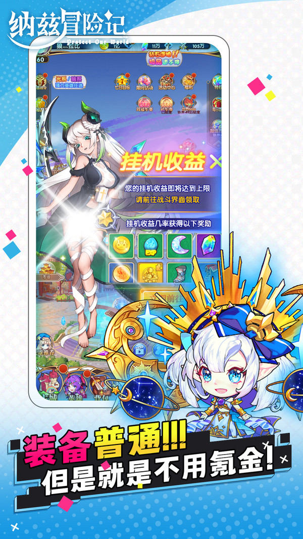 《纳兹冒险记》是一款二次元题材传世级放置类卡牌手游。过百位绝世英雄,化身超强守护,二十四小时候命!萌萌哒女神,听从你的召唤,随时出击!神秘的元素羁绊,任意的策略布阵,一切皆有可能!挂机收益丰富,睡觉升级不是梦!快来加入我们,带你体验真正的躺赢畅快感!【游戏福利】每日在线送十连,十连必出五星,五星萌神、神级装备登录免费送,挂机做任务送VIP,全部免费福利,限时领取,先到先得!