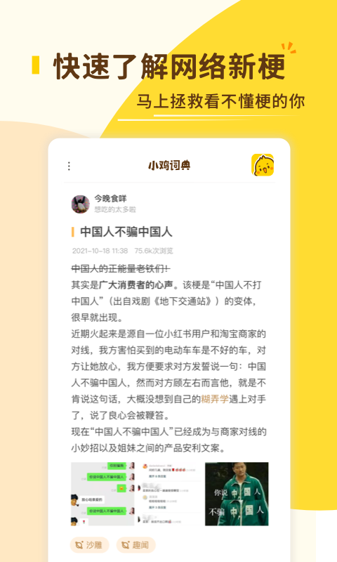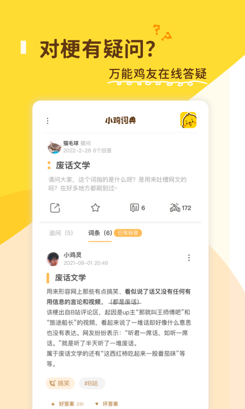 无论是网络新梗,还是拼音缩写、弹幕、流行语、甚至是小众黑话,如果你看不懂,就可以用小鸡来查。(查不到的还能提问,神通鸡友在线答疑~)