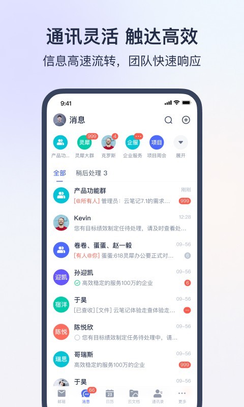 将办公中使用率极高的在线文档、云盘、邮件与即时沟通打通,使信息高速流转,团队快速响应,极大地提升了协作效率。