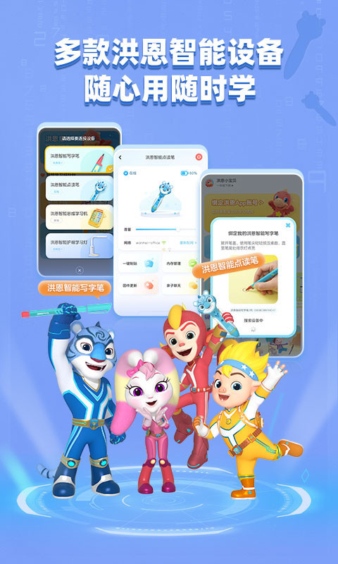 轻松连接洪恩智能练字笔、洪恩儿童智能点读笔等多款学习洪恩智能设备,通过网络连接等方式对硬件系统升级、内容优化等进行远程管理,自由随心的协同管理平台助力孩子随时随地高效学习!