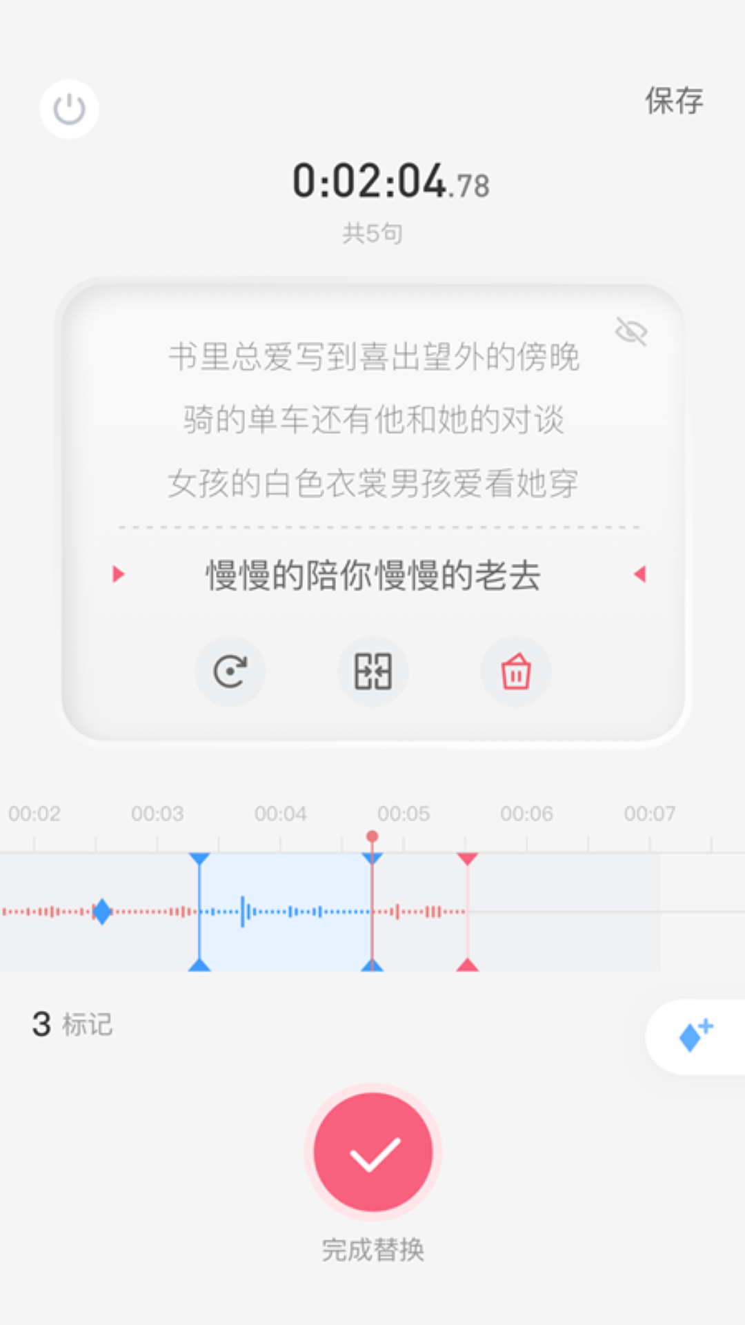 【生音录音】通过对录制内容和语音气口的识别,实现了“音频语句自动打点”技术功能的原创。随着录制者的语气停顿等对于录制内容进行AI自动打点。配合实时展示的识别区语音转写文字内容,一旦录制者出现口误错读等需重录的情况,即可在识别区选中待替换的句子无缝进行重读替换或删除,可以随处复制.在标记处添加注释,极大提升录制效率。随时随地分享作品到微信好友圈。