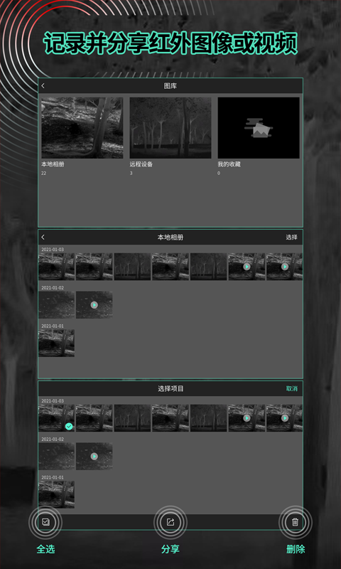 应用详情:TargetIR,红外热成像夜视仪专属移动端APP。通过Wi-Fi连接设备,用户可实时预览热像仪的高清画面,并对其进行全功能的远程控制操作。该APP除拍照、录像外,还可远程获取热像仪的图库,随时分享至其它应用平台,是一款真正实现全功能远程传输和控制的移动应用。