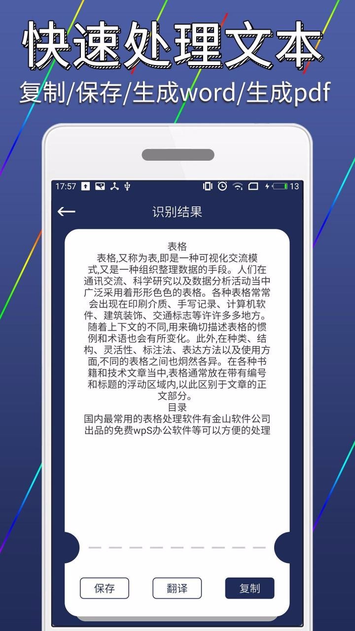 应用详情:不限次图片转文字,在工作或者生活中,我们常常要录入一些图片里的文字,但手动打字效率非常低,这个时候《图片文字识别转换》软件可以帮到您,它是一个自动识别图片上文字的软件,免除手动输入!