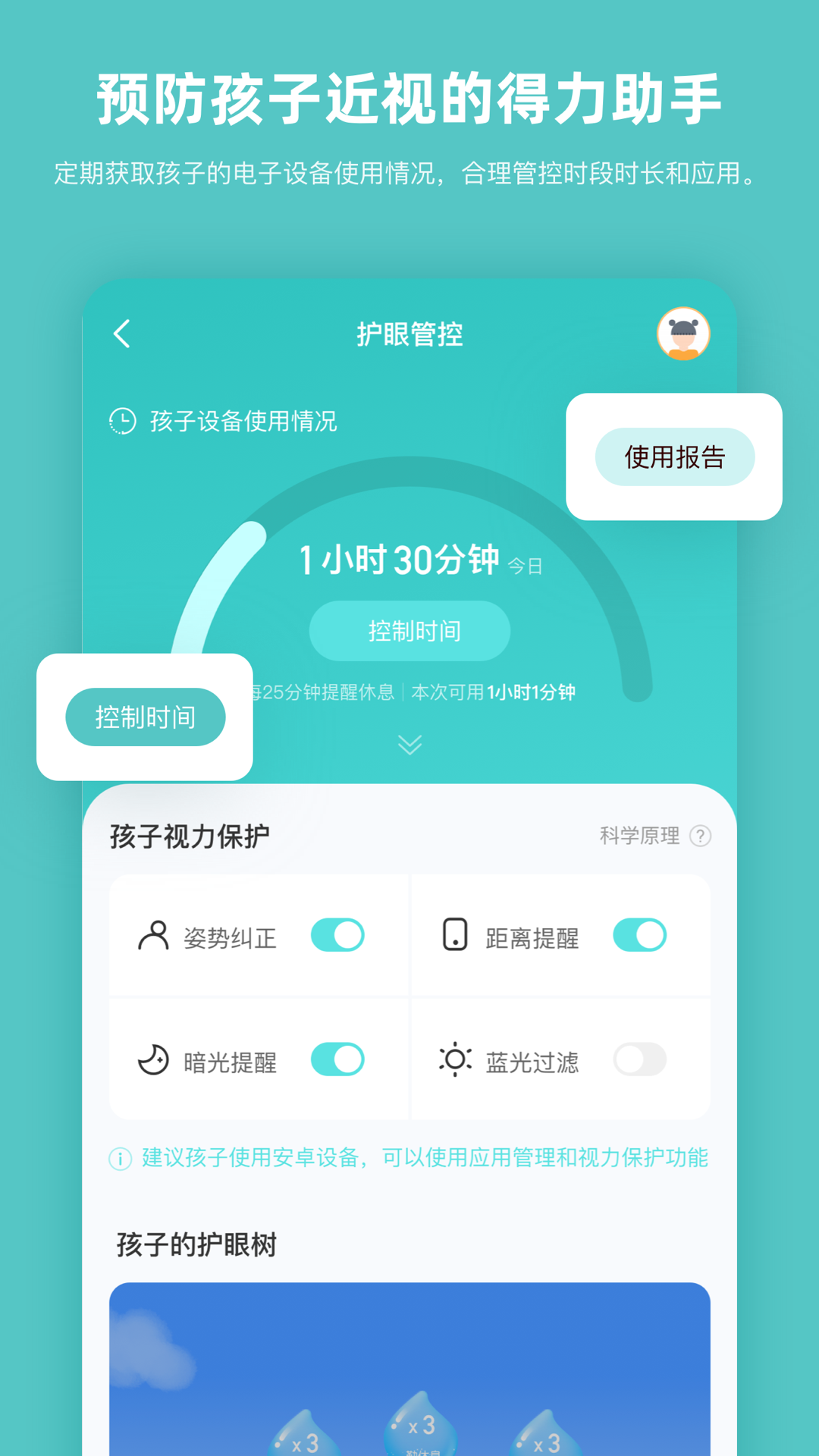 1、护眼提醒:在孩子电子产品上启用App,可开启姿势、距离、暗光和按时休息等提醒,引导孩子形成正确的用眼意识和行为。