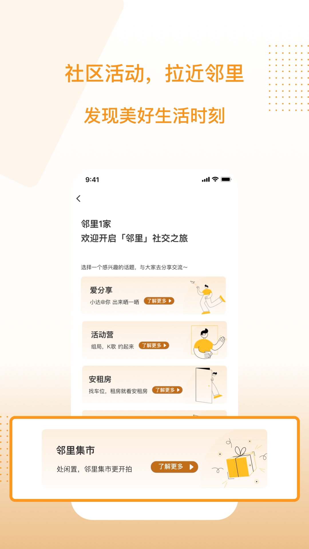 3.和谐邻里,通过日常分享、活动营、邻里集市等方式,加强居民之间的联系,意在打破这种城市人之间渐行渐远的尴尬关系,重塑小区邻里关系