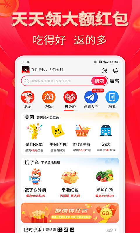 【品类丰富】 男装女装、护肤美妆、配饰鞋包、生活生鲜、零食百货、宠物用品、母婴家电、数码内衣、文体户外、运动车品,手机返利优惠券,应有尽有!