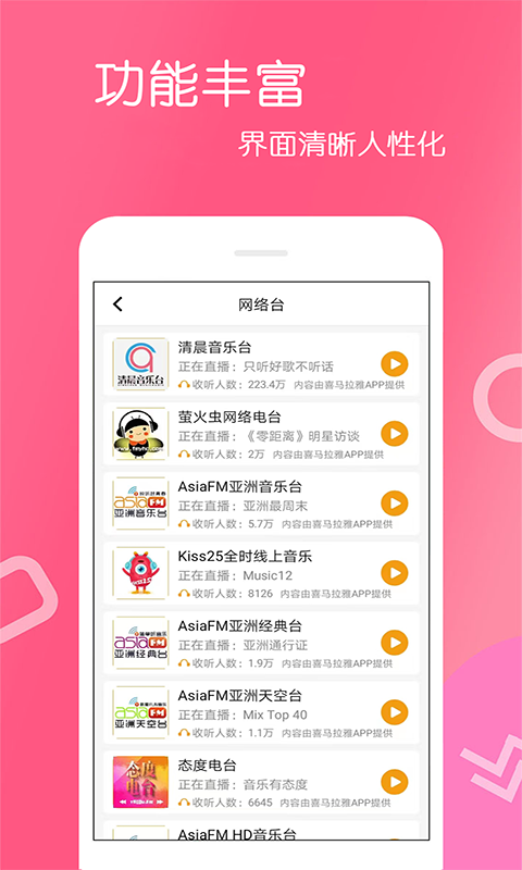 广播收录有上千个国内FM广播电台,拥有专线7*24小时不间断。
