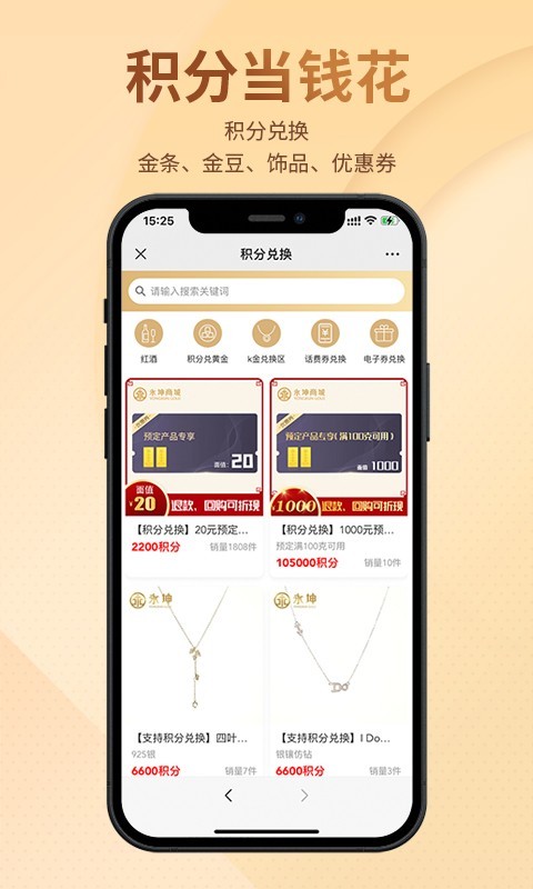 【积分购物】:商城独有的积分购物模式,积分可以免费兑换黄金,首饰,优惠券等