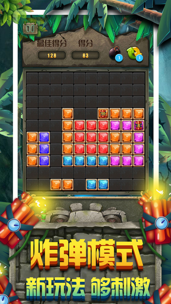 炸弹模式:10步以内消除掉绑有炸弹的方块所在的行或列,加大难度,等你挑战!