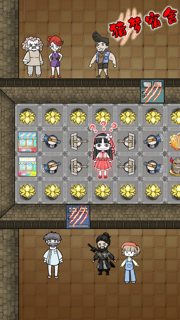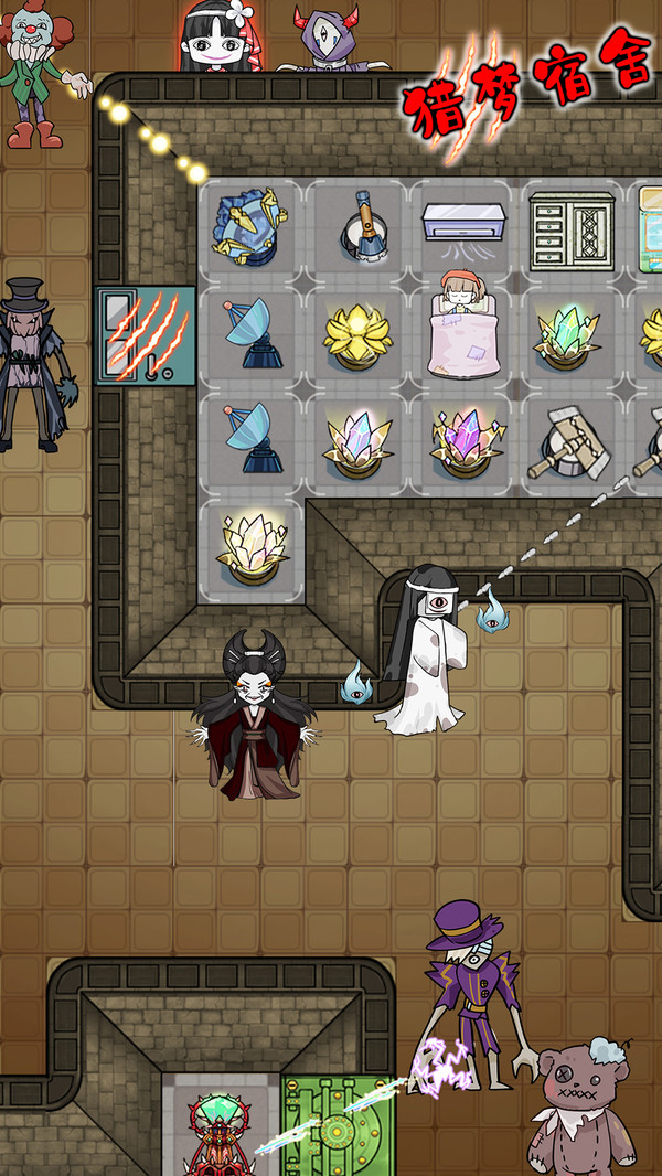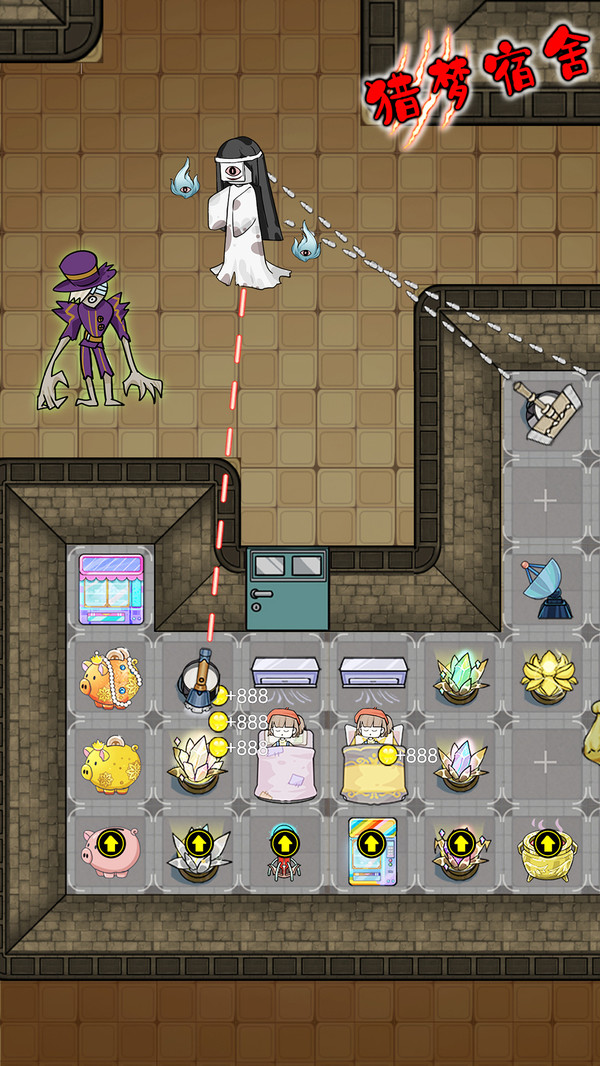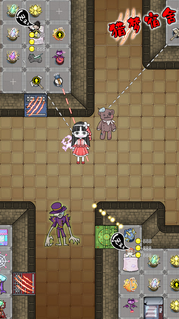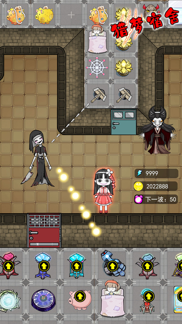 天黑了~,有什么东西闯进了宿舍! 警报~警报~ 猎梦者出没! 赶紧关好大门~躲进被窝~ “砰砰砰……砰砰砰……”——猎梦者正在狂躁地攻击着宿舍大门。 防守,攻击,加强防御,努力出击,击退猎梦者,获取胜利。