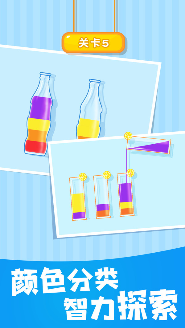 《倒水大师》是一款趣味益智游戏,游戏中有着十分丰富的关卡,玩法规则十分简单,玩家需要将玻璃杯中的水按照颜色进行分类排序,让不同颜色的水聚集到同一个玻璃杯中,一个具有挑战性且令人放松的游戏来锻炼您的大脑!