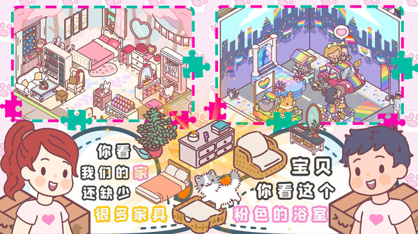 爱情,友情,哪一种是你想要在口袋里体验的呢?建立属于你和他或者他的可爱小家,各种家具、电器、墙纸、地板和装饰品。 每个房间都可以随心所欲地定制,或者从我们许多精心策划的家具套装中挑选 定期会有节日定制装饰,你可以通过领取用来装饰你的温馨小家 还有一只小爪子,是猫咪还是狗狗呢? 请开始你自己的袖珍冒险,这其中充满了生活、爱和你自己的可爱小家。