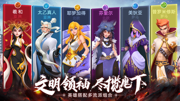 【文明领袖,尽揽麾下】游戏包含亚洲,北欧,罗马三大文明的各个英雄,可搭配各种各样的流派组合,来应对不同的战斗需求。每名英雄更可配搭不同的侍卫,千军万马,胜者为王!
