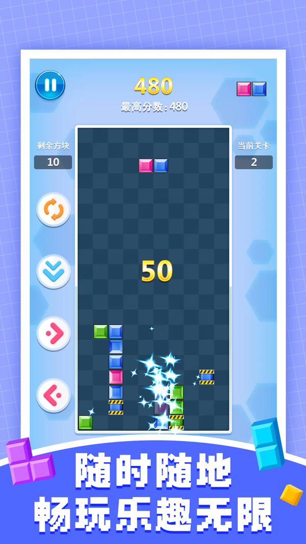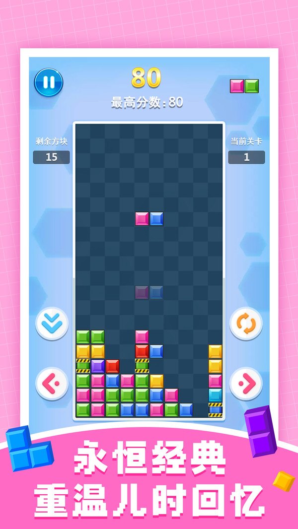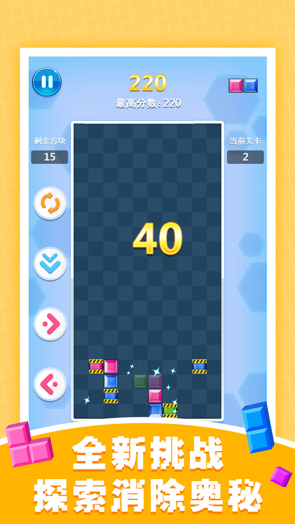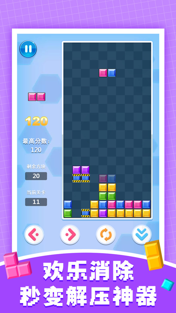 童年经典休闲俄罗斯消除小游戏来袭!突破经典玩法,完成俄罗斯方块和消消乐的完美结合! 如果你是一名俄罗斯方块的爱好者,那就不要错过这款老少皆宜的消除益智小游戏! 玩法: 1、通过控制掉落的颜色方块进行颜色匹配消除,至少四个相同颜色的方块连成一线即可消除。 游戏目标是消除所有障碍物,每过一关,奖励一定数量方块。用完所有方块或方块堆叠到顶端,则游戏结束! 2、将不同颜色的方块拖到棋盘中,填满任意一行或一列就可消除! 多种趣味玩法,任你挑战,让你的烦恼快速消除!