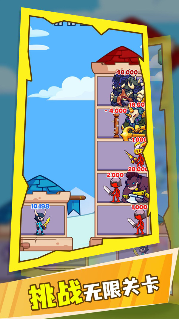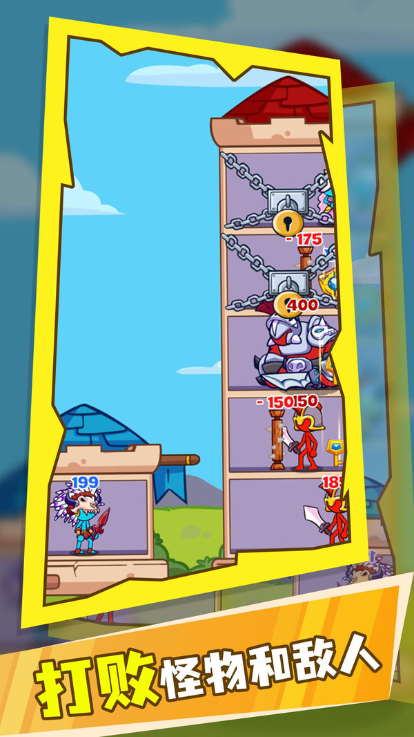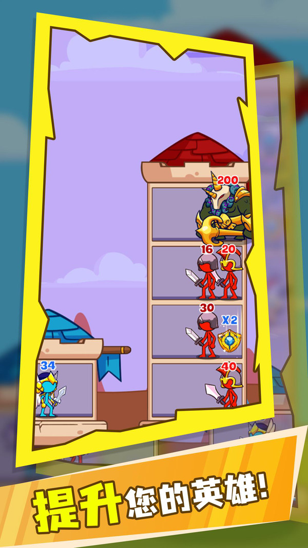 《火柴人英雄:战争之塔》是一款简单有趣又好玩的火柴人战争题材休闲益智类游戏。玩家在游戏中扮演能够合成进化的火柴人英雄,在充满敌人的战争之塔中冒险,击杀敌人,收集装备,拯救公主,寻找宝藏,解放所有塔楼,赢取战争的胜利。玩家控制角色在塔楼内挑战,赢得胜利后获得更强大的力量,最终击败敌人变得强大。玩家将在游戏中遇到各种挑战,穿梭于不同的塔楼之间,利用有限的力量击败敌人化为己用,一路上收集武器,寻找钥匙,消灭敌人,最终拯救出令人仰慕的公主殿下。
