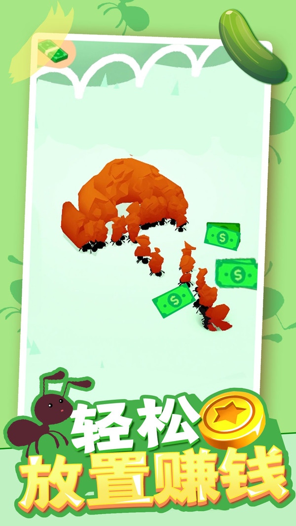 开局一只小蚂蚁,收益全靠蚂蚁搬!你将从一只小小的蚂蚁开始游戏,将道路中的食物搬运回到自己的蚂蚁巢穴中,去召集更多的同伴后,提升蚂蚁同伴的力量与速度等属性,向更高难度的关卡与障碍发起挑战!