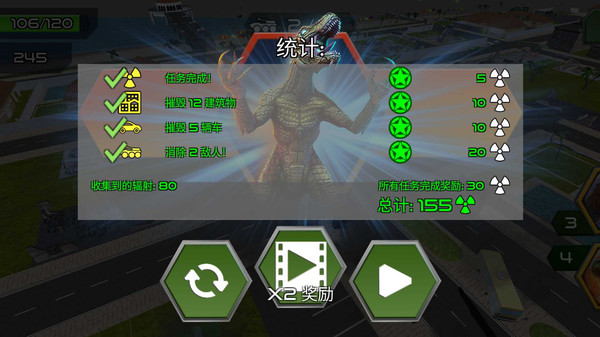 破坏!怪兽入侵城市!游戏中您将变成怪兽,闯入城市中,破坏建筑!累计能量进行更强力的进化! 游戏中有多个关卡,不同难度可以选择挑战,根据游戏要求完成破坏挑战,即可获得大量奖励,你可以解锁新的怪兽,也可以对怪兽进行升级进化! 另外怪兽还有专属技能,释放技能会加速破坏哦!