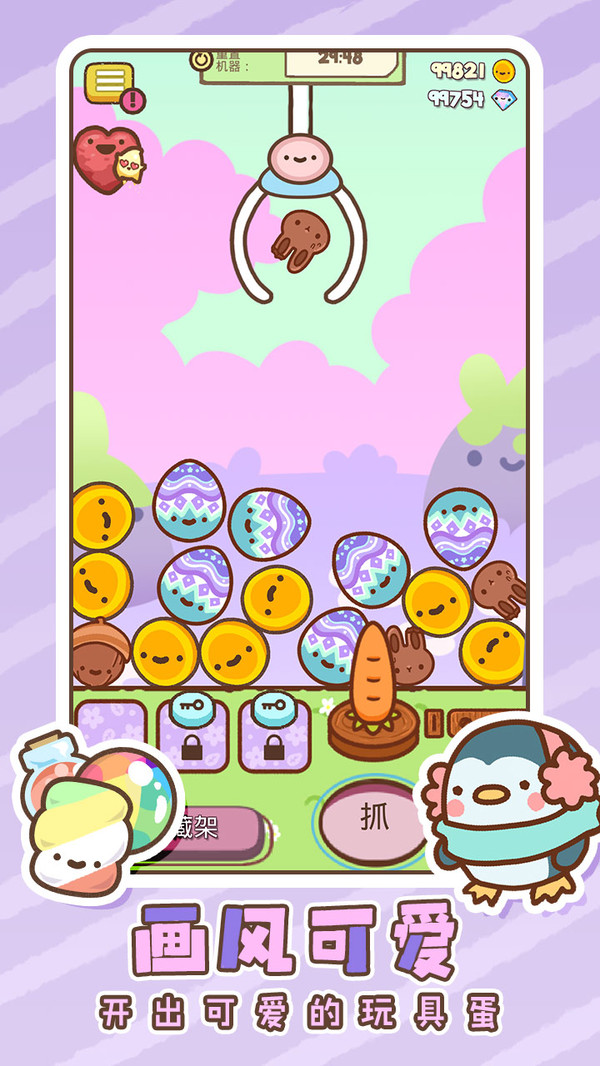 爪男孩是一台寂寞的抓娃娃机。虽然只有两根手指但它爱心满满。帮助爪男孩找朋友,让它再次开心起来吧! 在惊喜彩蛋中找到可爱又漂亮的玩具,集齐你的藏品柜吧! 哦哦!这就是罕见的惊喜彩蛋吗?在娃娃机复位前抓住它吧!