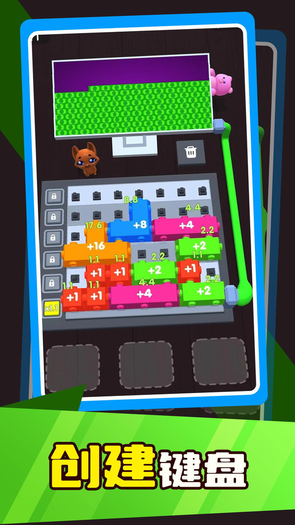 温馨提示:在游戏的新手教程中,需要将相同的键盘长按后拖到一起才能合并喔!合并后需要将键盘再拖上去安装,只有当键盘底下显示为绿色,才能成功安装,白色则表示无法安装在此处。