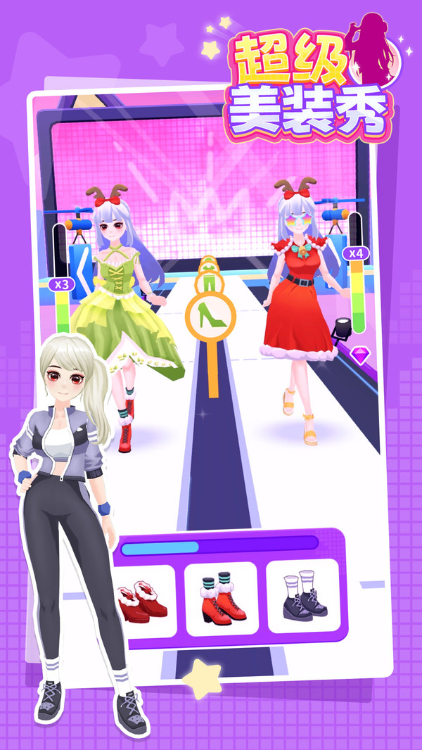 《超级美装秀》是一款模拟T台走秀变装的休闲闯关小游戏。玩家需要扮演一个设计师,为模特挑选适合场合时机的着装,同时比赛过程中,还会有一起同台pk的角色,你需要做到的是为模特挑选适合时机的着装,打败同台的角色,拿到高分,赢得走秀比赛。