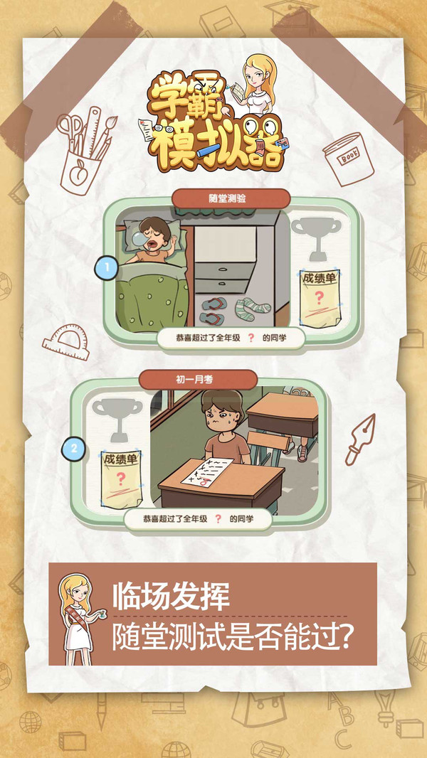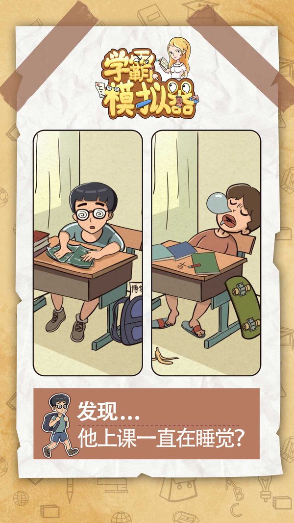 模拟学霸的真实体验是怎样的?在这里你可以帮助每一个同学,圈出他们的行为并且帮助他们解决困难,督促同学们提升自我。充满挑战的关卡,互动模式玩法选择多样,让你体验不一样的学霸。 核心玩法: 找出场景中符合问题的区域并且点击圈出即可进入到下一个问题,当一个场景内7个问题都解决即成功通关,可以进行后续关卡的挑战。另外游戏还有随堂测试等玩法 游戏特色: 模拟学霸生活 休闲卡通风格 丰富关卡挑战 道具人物收集 随堂考试测验
