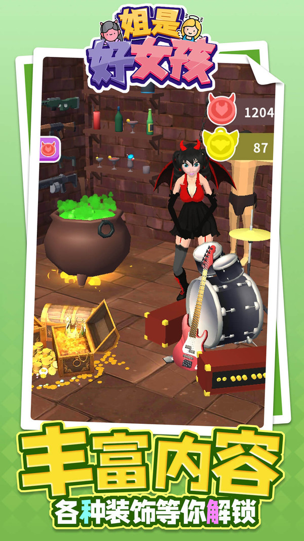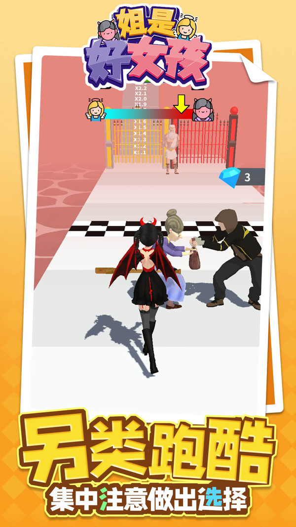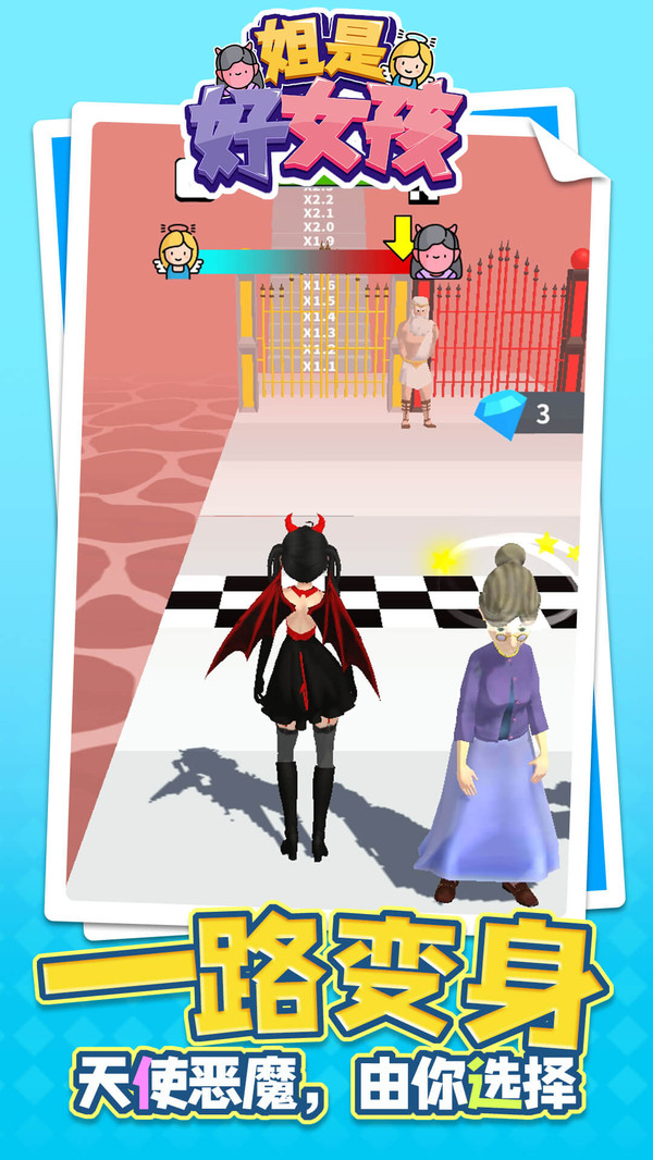 《姐是好女孩》是一款轻松休闲的过关小游戏,在游戏中会遇到不同的事件,玩家只需要拾取物品进行对应的选择即可变身天使或者恶魔,做好事还是做坏事完全可以随心,走向地狱还是走向天堂都将由你决定。玩法十分轻松只需要滑动屏幕即可控制角色移动,通关时纯度越高奖励越高。