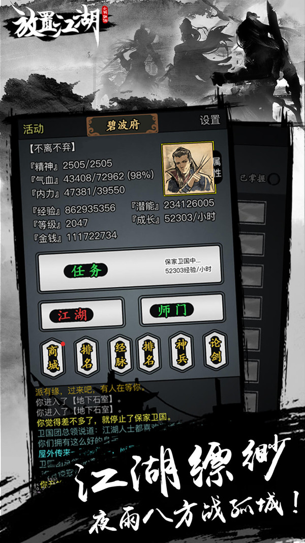 体验文字类武侠,从初出茅庐,到小有名气,再到名动江湖,打造不一样的游戏体验。