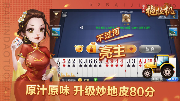 拖拉机又名升级、双升、80分,在全国各地都有各种规则的玩法和叫法。本游戏使用最为流行的2副牌打法,采用四人结对竞赛,抢分升级的方式进行。基本规则与升级相同,但由于增加了牌的张数(由54张增加到108张),取消了对底牌压分的限制,使牌局的变化更为丰富。