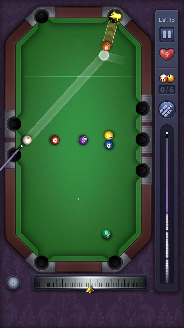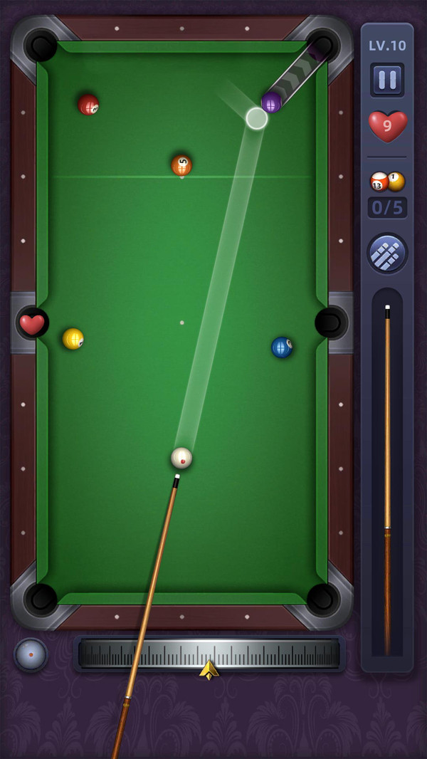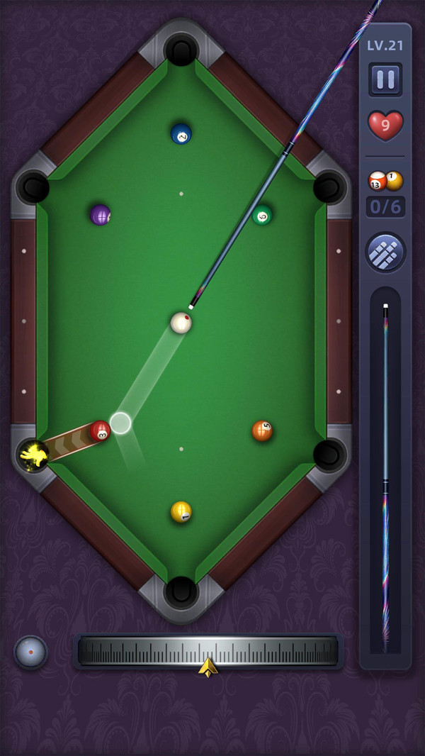 模拟真实的物理原理,体验经典的桌球游戏! 这是一款桌球闯关游戏,使台球爱好者在手机上就能体验进球的乐趣,感受新颖的台球闯关玩法。 游戏玩法: 根据关卡要求,在固定击球次数内完成每个关卡需要进的球数,即可获得胜利; 可以通过调整打击力度和击球方向,让你的进球概率大大提高; 几百种球杆任你选择; 多种道具助你一臂之力 还有精美宝箱等着你来开!