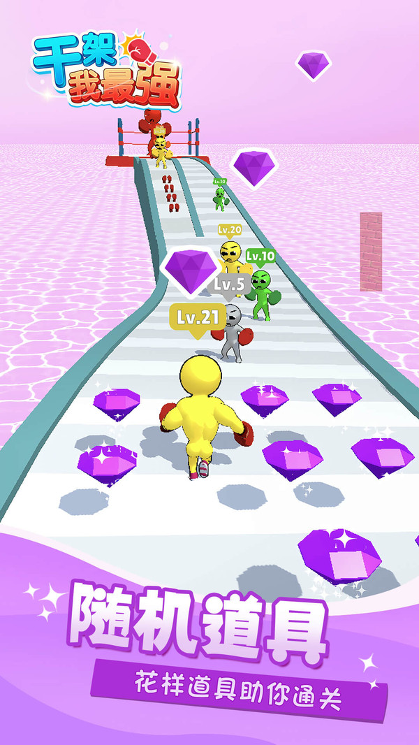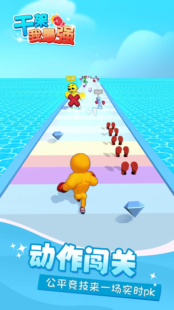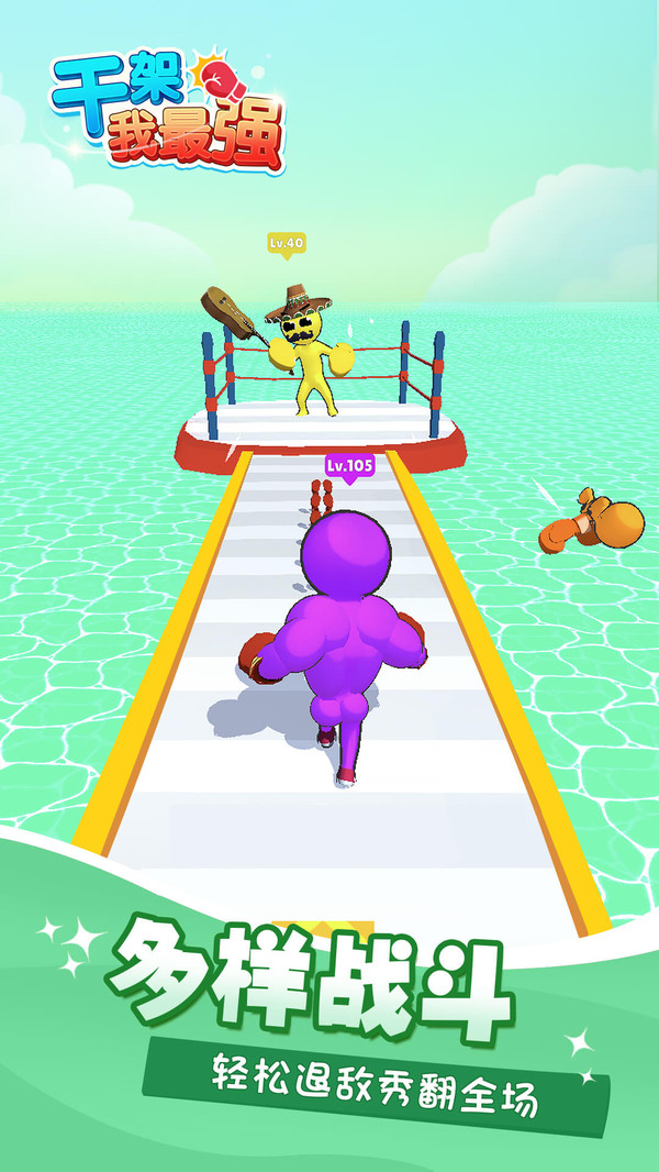 《干架我最强》这是一款跑酷锻炼干架的小游戏,多收集拳头提升自己肌肉,击败低等级敌人,强大自己,最后打败boss! 游戏中注意敌人的等级,等级高于你的敌人要躲开,攻击等级低于你的敌人,才能强大自己,最后点击击打boss时候,一定要快速点击才能击飞更远!