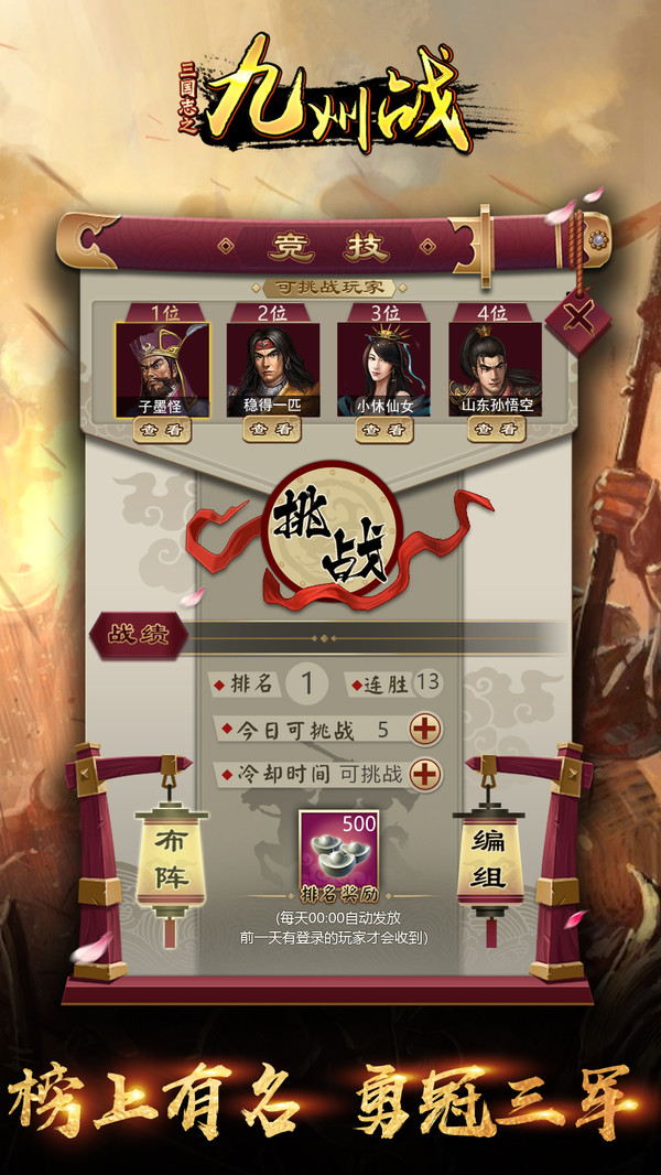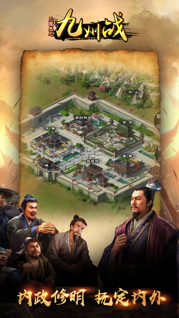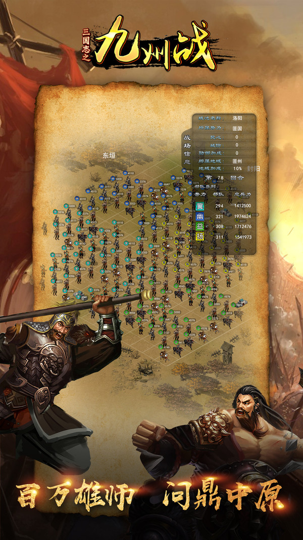 《三国志之九州战》是一款以三国时代文化为背景,精美细致的画面风格、真实细腻的游戏场景、恢宏壮阔的战争场面,真实还原三国地图和历史名将,实现十万部队同屏作战,结合模拟建设与战斗策略为一体的策略类手机网络游戏。游戏沿用了SLG经典回合制的战斗模式,拥有丰富多样的策略玩法。游戏中排兵布阵,不同的战斗策略,三大兵种相生相克,武将强大的技能释放都将会左右整个战局。玩家将扮演九州之中的一员大将,通过游戏中的城池建设,武将培养,城池战斗,城池占领等多个玩法系统,不断壮大自己的实力,运用策略智谋与其它玩家进行较量,让你在尽享游戏激情快感的同时,亲历到前所未有的古代战争场面,在乱世中大展宏图,辅佐帝王成就春秋霸业。