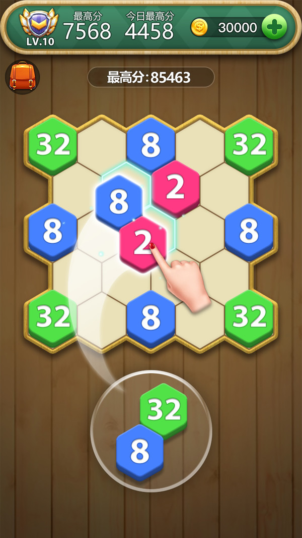 -相同数字的六角形方块将被合并成一个更大数字的方块。