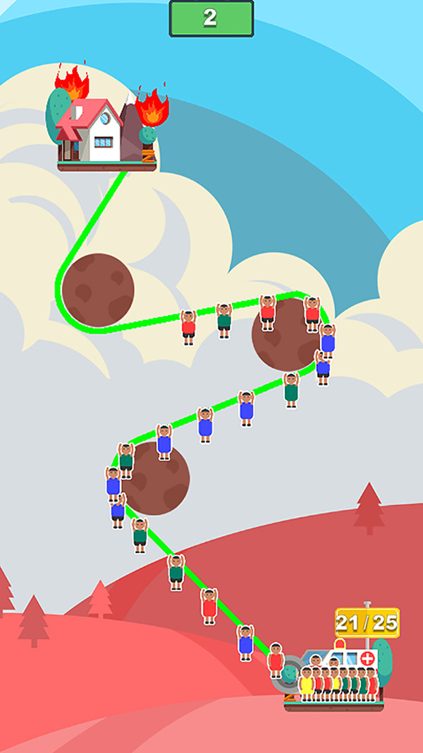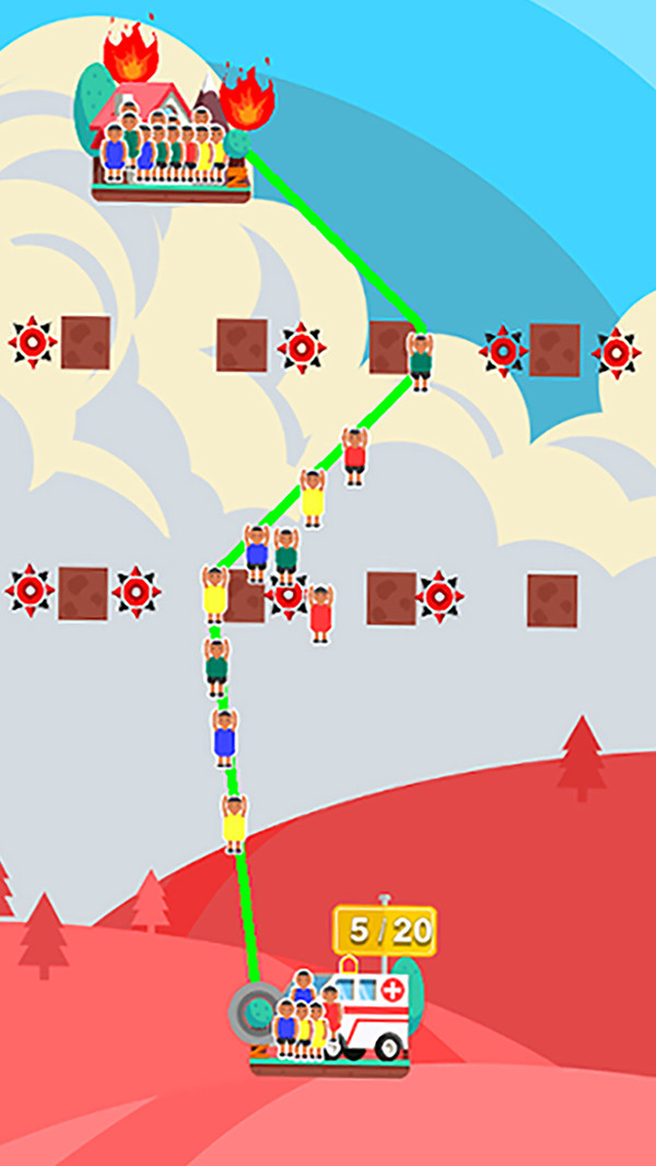 可怜的打工人被火宅困扰了,快来帮帮他们脱离火海吧。 你需要伸出救援的绳索,并找到一个最佳路线帮助他们逃离