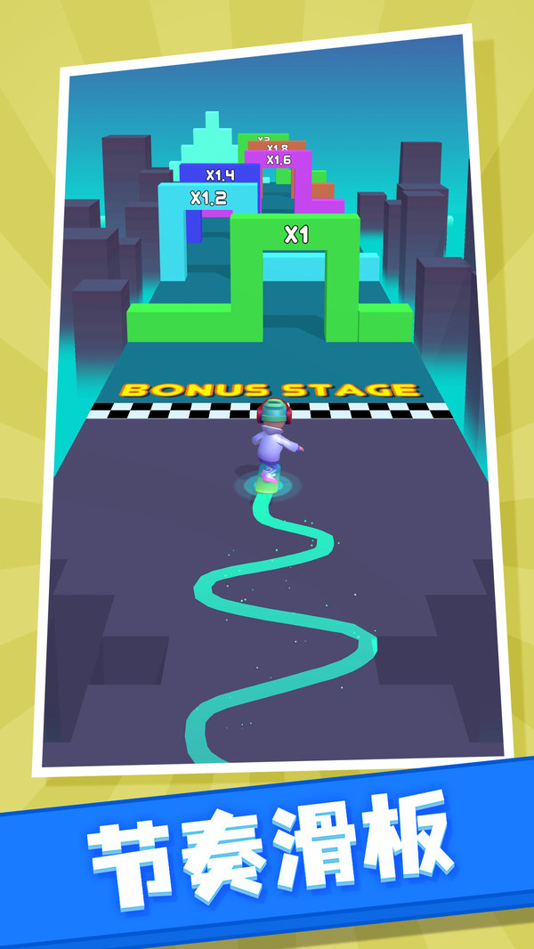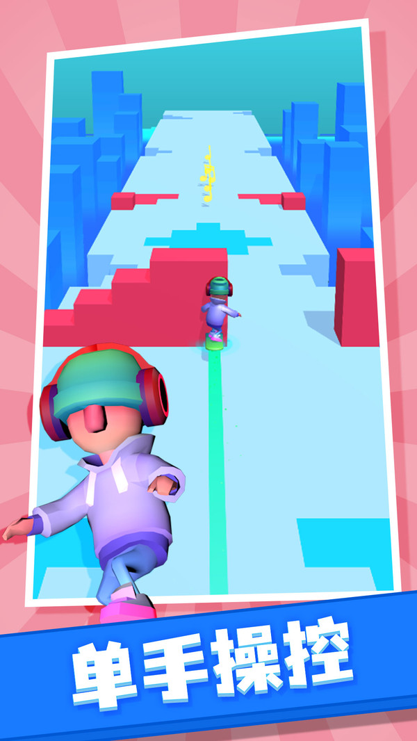 《节奏滑板》是一款休闲音游跑酷类游戏,玩家们在游戏当中不仅可以去寻找多种道具来帮助自己快速的赢得游戏的胜利,而且每一个关卡中都有一定程度的障碍,大家必须要快速的躲避才可以让自己不受到任何的伤害就闯关成功。