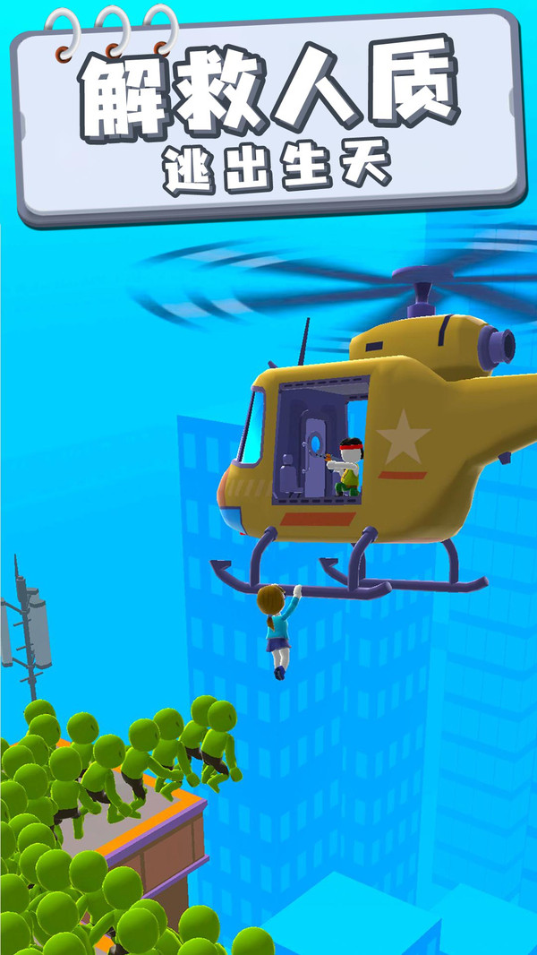 在前往救援的战斗中,你将乘坐直升机,通过武器掩护救援人质进行逃跑,直至人质搭乘上直升机,解救成功!