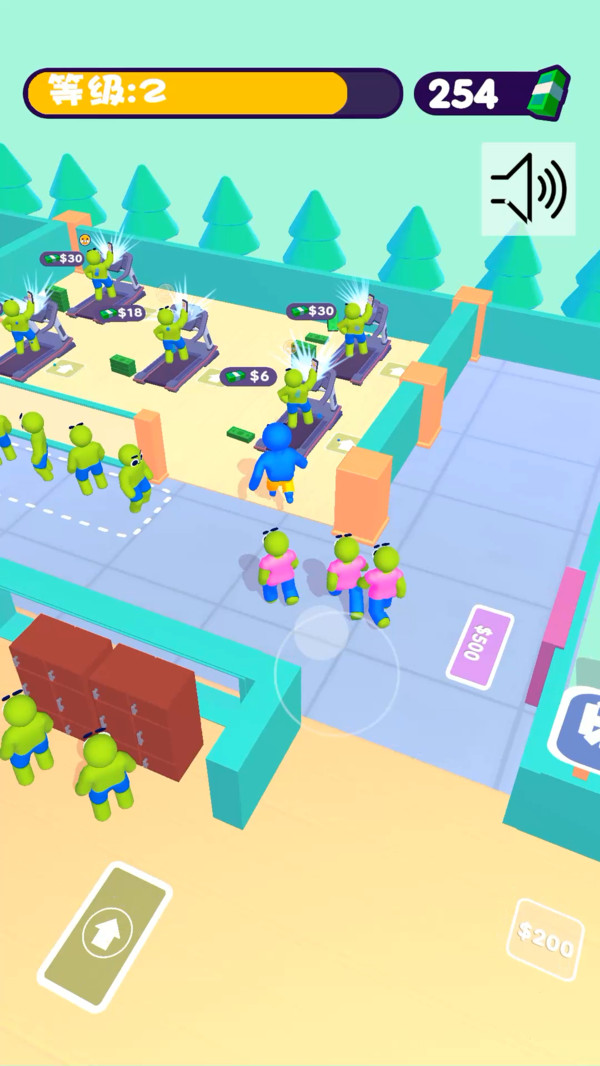 游戏玩法:通过移动屏幕来操控肌肉猛男,负责扩建场地、引进新器材、招揽顾客来健身。